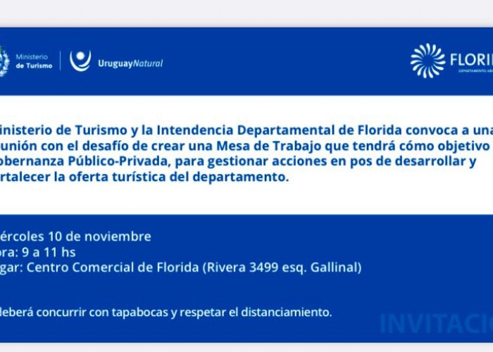 El Ministerio de Turismo y la Intendencia de Florida convocan a una reunión para el próximo miércoles con el fin de “gestionar acciones en pos de desarrollar y fortalecer la oferta turística del departamento”.