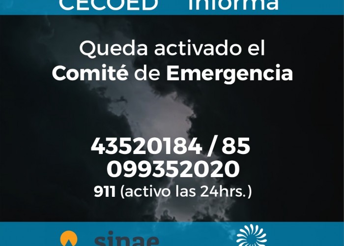 En la noche de este miércoles se activó el Comité Departamental de Emergencia, decisión adoptada por el presidente del CECOED, el Intendente Guillermo López, tras el anuncio de lluvias y tormentas para nuestra zona por el temporal de Santa Rosa.