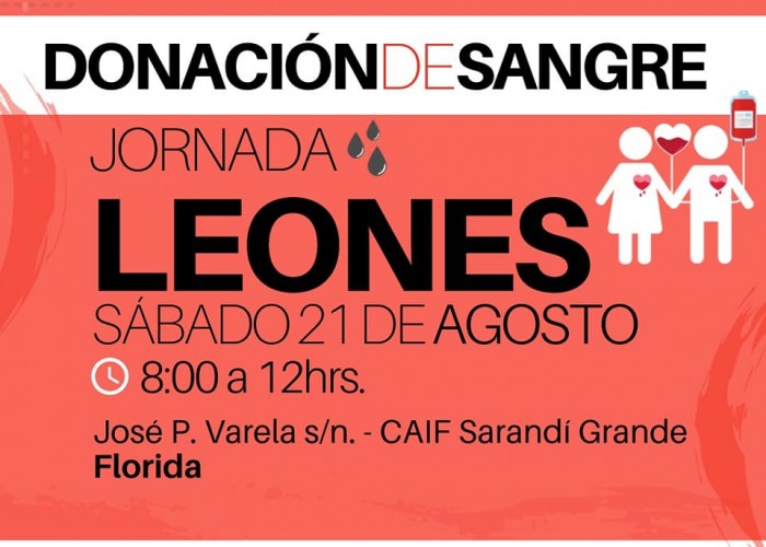 El próximo sábado se desarrollará una jornada de donación de sangre en Sarandí Grande, instancia organizada por el Club de Leones de la segunda ciudad del departamento.