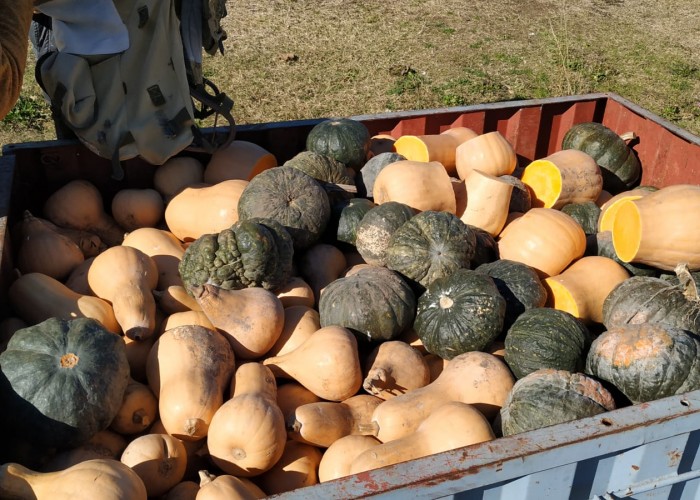 Sandra Peña, comerciante de Florida, se instaló con un tráiler frente a la Escuela 8, regalando zapallos a decenas de vecinos.