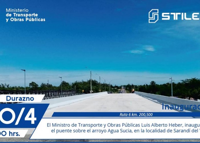 Este viernes se inaugura el puente sobre arroyo Agua Sucia en Sarandí del Yí, límite entre Durazno y Florida. Estará presente el Ministro de Transporte y Obras Públicas, Luis Alberto Heber.
