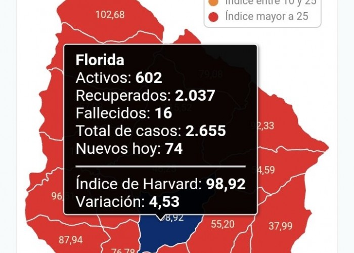 La situación por Coronavirus se continúa agravando en Florida, pasando nuevamente los 600 casos activos, y según el índice de Harvard, es el cuarto departamento con mayor porcentaje.