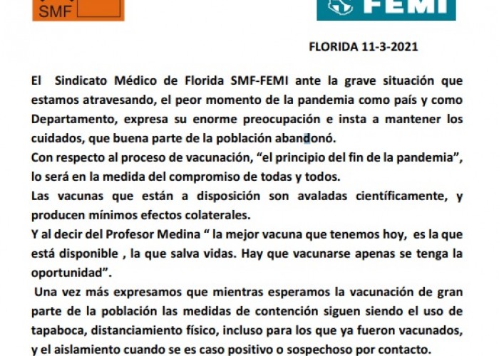 Sindicato Médico de Florida (SMF) y FEMI (Federación Médica del Interior (FEMI), emitieron un comunicado mostrando la preocupación por la situación que atraviesa Florida y el país, “e instan a mantener los cuidados, que buena parte de la población abandonó”.