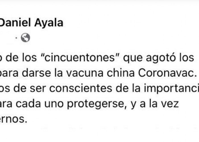 El Dr. Daniel Ayala, Médico, gremialista, comunicador, y referente del Frente Amplio en Florida, realizó una publicación en su red social Facebook vinculada al proceso de vacunación contra la Covid-19, indicando que es uno de los “cincuentones” que “agotó los cupos” para inocularse, y exhortó a “no instalar una brecha donde no la hay”, haciendo referencia a comentarios instalados sobre que “frenteamplistas no se vacunan por qué están en contra del gobierno”.