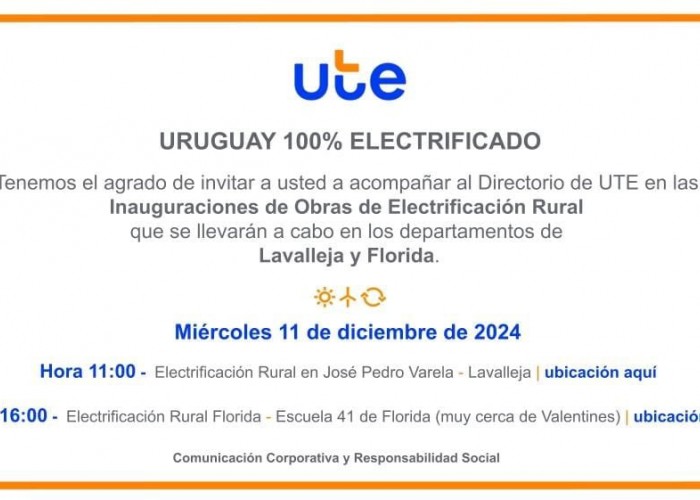 Este miércoles UTE estará inaugurando en zona de José Pedro Varela y la Escuela 41 de Florida, cercana a Valentines, las obras de Electrificación Rural.