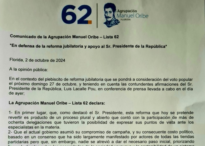 En defensa de la reforma jubilatoria y en apoyo al. Presidente de la República, Luis Lacalle Pou, la Agrupación Manuel Oribe emitió comunicado.