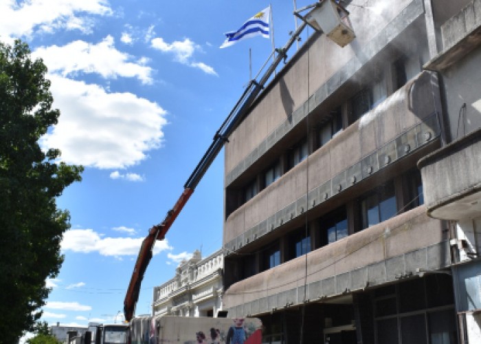 En la tarde de este miércoles, personal de la Dirección de Gestión Ambiental de la Intendencia llevó adelante tareas de limpieza mediante hidrolavado en la fachada del Edificio Central de la comuna.