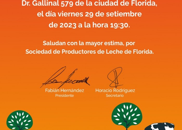 El viernes 29 de setiembre la Sociedad de Productores de Leche de Florida realizara la Asamblea General Ordinaria de la Institución.