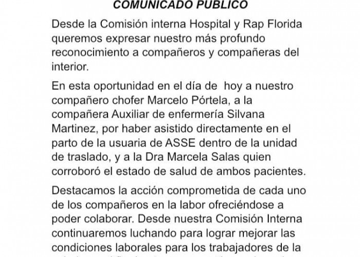 La Federación de Funcionarios del Hospital de Florida y la RAP emitió un comunicado donde reconoce al chofer Marcelo Pórtela y la Auxiliar de enfermería Silvana Martínez, por haber asistido directamente el parto de usuaria de ASSE dentro de la unidad de traslado.