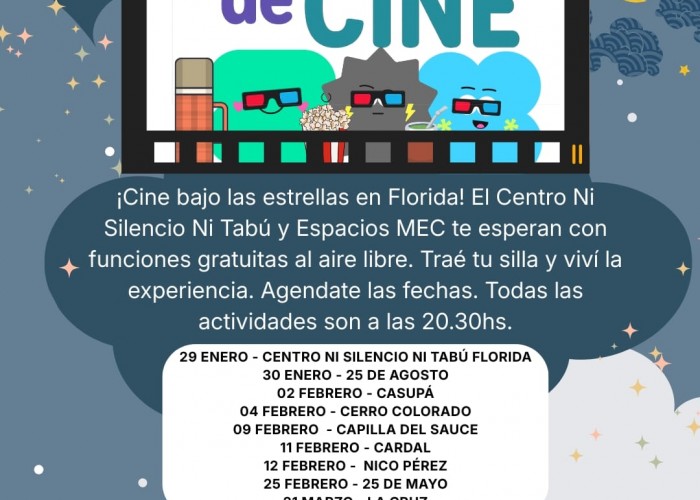 Florida será escenario del ciclo “Encuentros de Cine”, una propuesta de cine al aire libre que recorrerá distintas localidades durante los meses de enero, febrero y marzo, con funciones gratuitas para todo público.