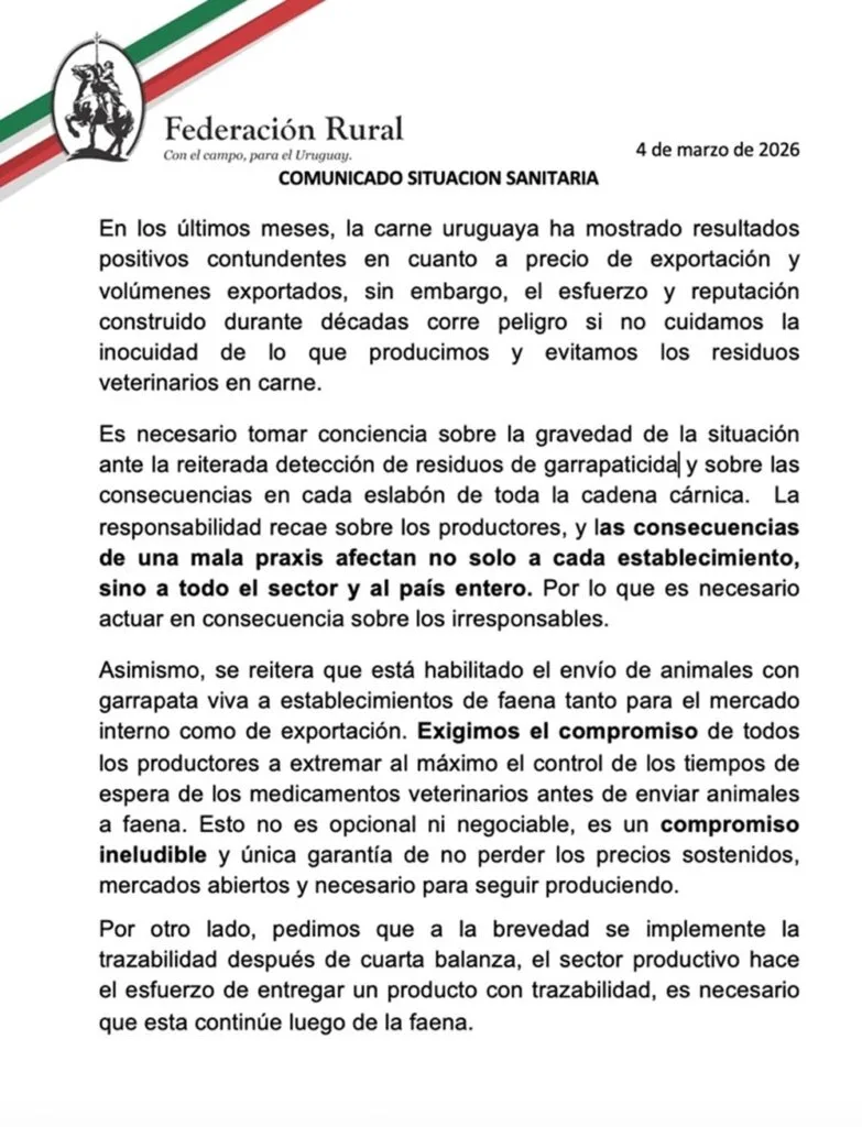 En síntesis, la Federación está realizando un llamado a la responsabilidad colectiva, a la disciplina sanitaria y a la defensa de la reputación de la carne uruguaya como activo estratégico del país.
