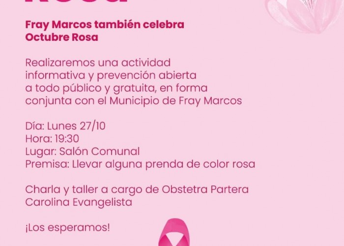 Este lunes, en el Salón Comunal de Fray Marcos, se llevará a cabo una charla a cargo de la Obstetra Partera, Carolina Evangelista, en el marco de “Octubre Rosa”.