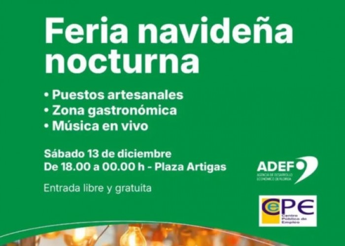 El sábado 13 de diciembre de 18:00 a 00:00 horas se realizará en la Plaza Artigas de nuestra ciudad la Feria Nocturna Navideña, ofreciendo un espacio ideal para las compras navideñas nocturnas.