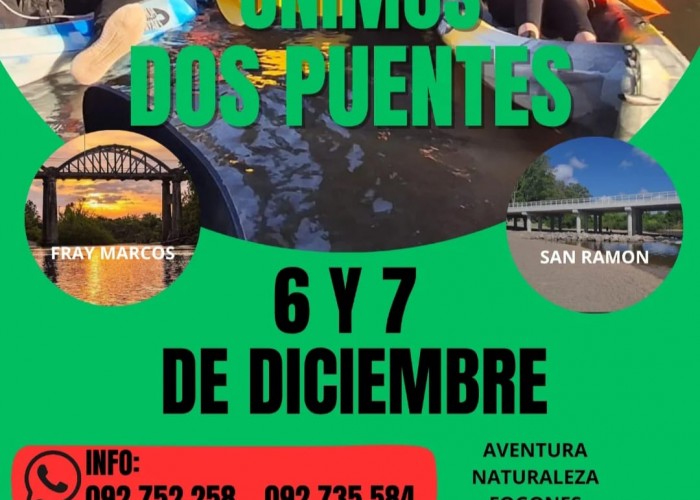Este fin de semana, sábado 6 y domingo 7 de diciembre, se realizará la primera edición de la Travesía “Unimos Dos Puentes”, una propuesta que invita a disfrutar del río, la aventura y la naturaleza mientras se recorren los tramos que unen los puentes de Fray Marcos y San Ramón.