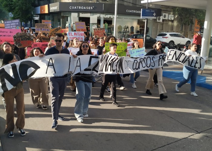 Estudiantes y docentes del Centro Regional de Profesores se movilizaron en reclamo de “no a la eliminación de cursos y no a la semipresencialidad forzada”.