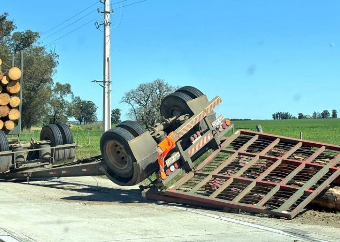Una zorra de un camión cargado con palos volcó en el kilómetro 87 de la ruta 5 en la tarde de este viernes.