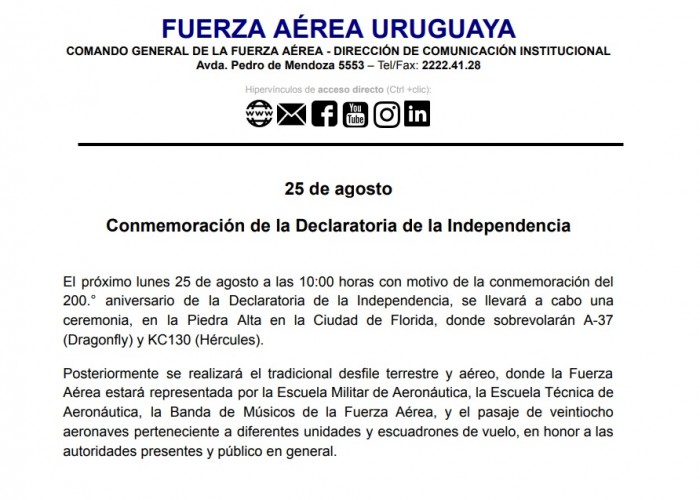 La Fuerza Aérea Uruguaya comunicó que el 25 de Agosto sobrevolarán el desfile en la ciudad de Florida un total de 28 aeronaves. Además habrá sobrevuelo durante el acto en la Piedra Alta y participación en el desfile terrestre.
