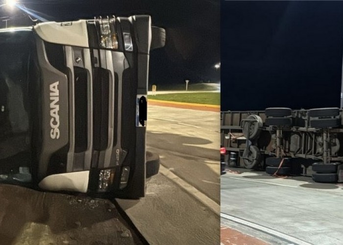 Un camión volcó en la rotonda de la ruta 5 y 12 en la noche de este domingo, luego de que su conductor perdiera el control del pesado vehículo.