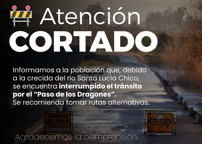La Intendencia de Florida, a través de la Dirección de Tránsito, informó que el pasaje por el “Paso de Los Dragones” se encuentra actualmente interrumpido.