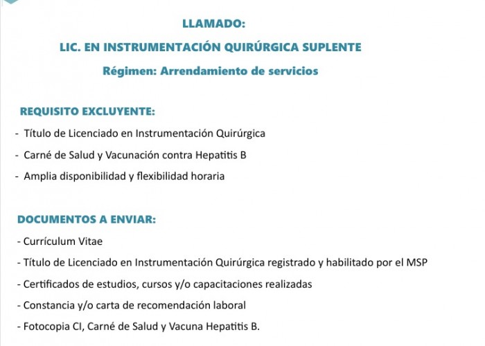 COMEF realiza llamado para Lic. en Instrumentación Quirúrgica suplente en régimen de arrendamiento de servicios.