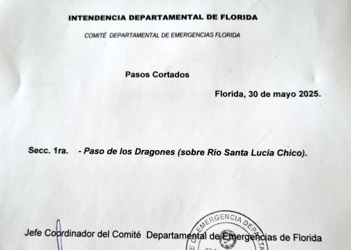 El Comité Departamental de Emergencias informa que el Paso de los Dragones (sobre río Santa Lucia Chico), se encuentra cortado.