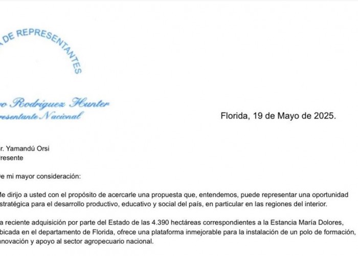 El diputado Álvaro Rodríguez Hunter elevó una propuesta formal al presidente de la República, Yamandú Orsi, para que las 4.390 hectáreas de la Estancia María Dolores, recientemente adquiridas por el Estado en el departamento de Florida, se conviertan en un centro estratégico para el desarrollo rural, educativo y agroindustrial del país.