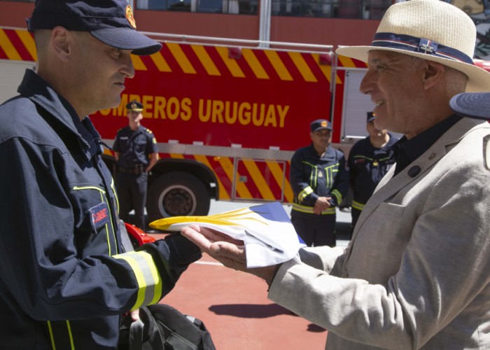 El ministro del Interior, Carlos Negro, entregó el pabellón nacional a los 31 efectivos de Bomberos que viajarán a Chile para colaborar en la zona declarada en estado de catástrofe por los incendios ocasionados en las regiones de Ñuble y Biobío. “Es un reconocimiento a la entrega, el coraje, el compromiso y la solidaridad”, aseveró el jerarca.